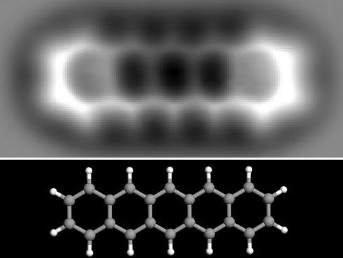 ۱۱- اتصالات مولکولی در یک مولکول پنتاسن: این عکس در سال ۲۰۰۹ به وسیله محققان IBM از یک مولکول پنتاسن گرفته شده است. شیوه استفاده شده، نوع تکامل یافته همان فناوری بینینگ و روهرر است. به طوری که می بینید اجزای مولکول ۱٫۴ نانومتری نتاسن کاملا مشخص هستند.