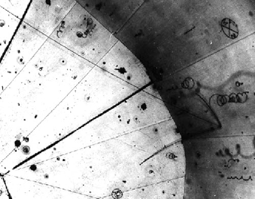 ۷- نخستین نوترینوی ثبت شده (۱۹۷۰): در ۱۳ نوامبر سال ۱۹۷۰، با استفاده از دو فناوری عکاسی و محفظه های جوشان، برای نخستین بار نوترینو مورد رصد قرار گرفت. در این عکس نوترینو، به یک پروتون برخورد کرده است و باعث ایجاد سه ذره شده در سمت راست شده است. نوترینو به مزون مو تبدیل شده است که به صورت خط طولانی مرکز مشخص است، خط کوتاه، نشاندهنده پروتون است و سومین خط، مزون پی است.