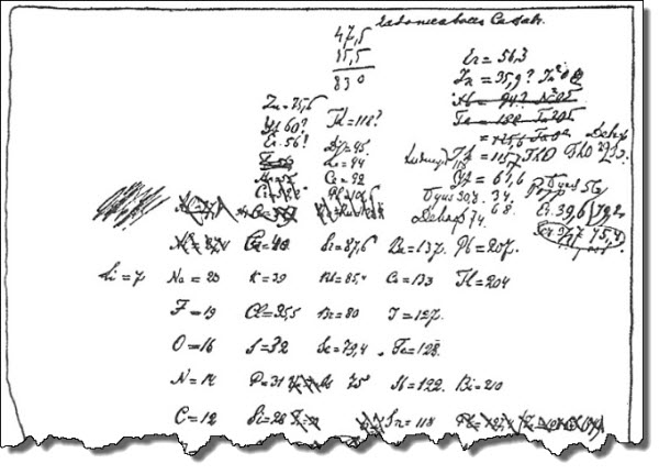 ۲- تصویری از جدول تناوبی اصلی، رسم شده توسط دیمیتری مندلیف: تلاش «دیمیتری مندلیف» باعث شد که عناصر در یک جدول به شیوه منظم و عقلانی مرتب شوند. او در نیمه قرن نوزدهم، عناصر شناخته شده را در یک جدول تناوبی قرار داد و توانست جایگاه عناصر ناشناخته ای را که پس از ان کشف شدند را هم مشخص کند.