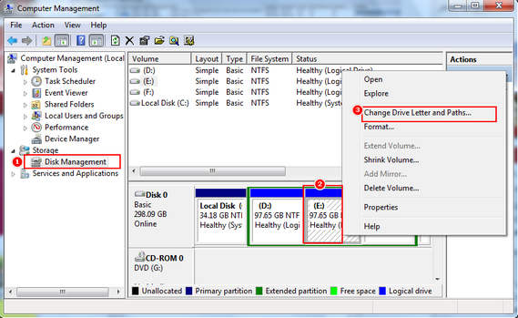 حالا لیستی از درایو ها و حافظه های خارجی متصل به کامپیوتر به نمایش در می آید، روی درایوی که می خواهید مخفی کنید کلیک راست کنید و گزینه Change Drive Letter and Paths… را انتخاب کنید