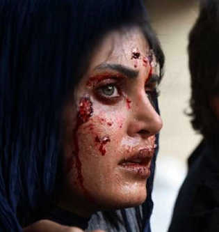 تصویر گریم متفاوت از الناز شاکردوست در فیلم سینمایی «اینجا تاریک نیست» را نشان می دهد. او به همراه مصطفی زمانی از بازیگران اصلی این فیلم است.