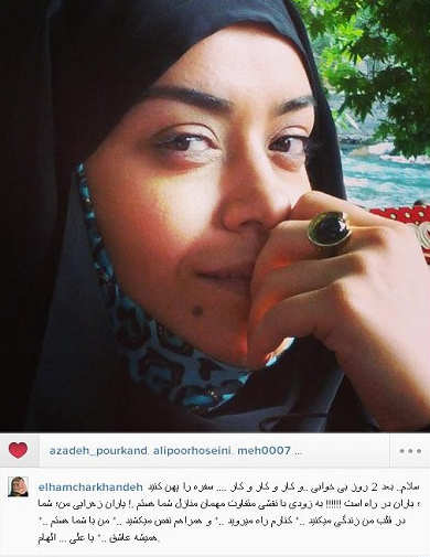 الهام چرخنده“سلام بعد از ۲ روز بی خوابی ..و کار و کار و کار …. سفره را پهن کنید ؛ باران در راه است !!!!!! به زودی با نقشی متفاوت مهمان منازل شما هستم .! یاران زهرایی من؛ شما در قلب من زندگی میکنید ..* کنارم راه میروید ..* و همراهم نفس میکشید ..* من با شما هستم ..* همیشه عاشق ..* یا علی … الهام”