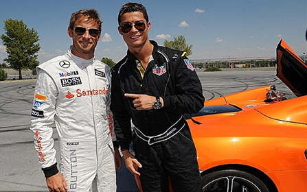 کریستیانو رونالدو با جیسون باتن راننده مطرح و بریتانیایی فرمول یک برای دقایقی سرعت سرسام آور اتومبیل های فرمول یک را تجربه و لباس رانندگان فرمول یک را به تن کرد.