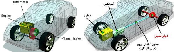 - قرارگیری موتور در خودروهای دیفرانسیل عقب مطابق شکل (موازی با طول خودرو)عمودی و دیفرانسیل جلو موازی با عرض خودرو (افقی) است)