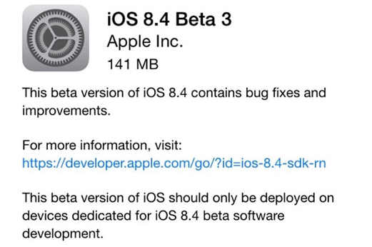 شرکت اپل ، سومین نسخه آزمایشی سیستم عامل iOS 8.4 را برای ارزیابی بخش های مختلف در اختیار توسعه دهندگان و کاربران علاقمند قرار داد. این نسخه آزمایشی سیستم عامل iOS اپل، بیلد ۱۲H4098c نام گرفته و در بخش iOS Developer Center سایت اپل قابل دسترس می باشد. حدود چند هفته دیگر کمپانی اپل در کنفرانس WWDC 2015، نسخه اصلی و جدید سری سیستم عامل اختصاصی خود، iOS 9 را معرفی خواهد کرد.