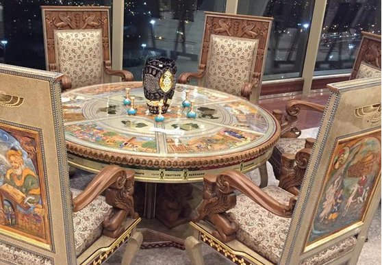 این استاد هنرمند اصفهانی پیش از این در گفتگو با یکی از رسانههای داخلی عنوان کرده بود که با همکاری دوست هنرمندش «علی شاهمیوه» استاد خاتمکاری این میز و صندلیها را طراحی کرده است. این دو هنرمند پیش از این هم با همکاری هم و با تلفیق دو هنر خاتمکاری و نقاشی آثار ماندگاری خلق کردهاند.