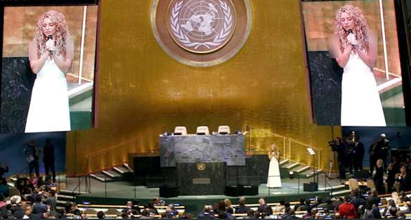 شکیرا خواننده مشهور کلمبیایی در سازمان ملل متحد موسیقی زنده اجرا کرد که واکنش هیئت را در بر داشت.