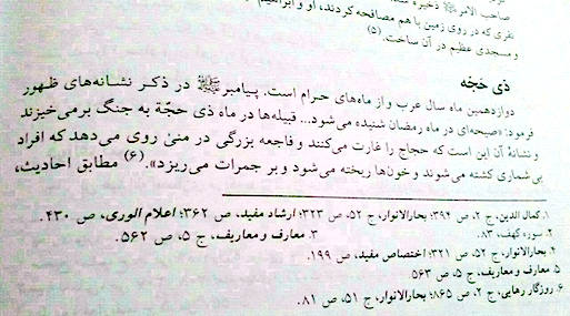 ۳- ابن حماد در «فتن» در جلد اول صفحه۳۴۱ بیان کرده است که در ماه ذیالقعده قبایل یارگیری میکنند و آن سال حاجیان غارت میشوند و جنگی در منا رخ میدهد، تعبیر روایت این است که کشتههای بسیاری خواهد داشت و به قدری کشته میشوند که خون جاری میشود و از منا به جمره عقبه میرسد.