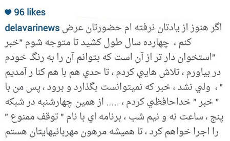 دلاوری ، مجری خبر ۲۰:۳۰ بخش صرفا جهت اطلاع” کناره گیری خود را با لحنی کنایه آمیز از گویندگی خبر خداحافظی کرد، وی در مورد علت کناره گیری اش متنی را در اینستاگرام منتشر کرد. ...