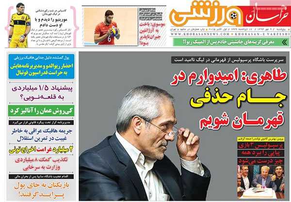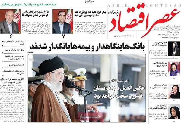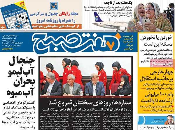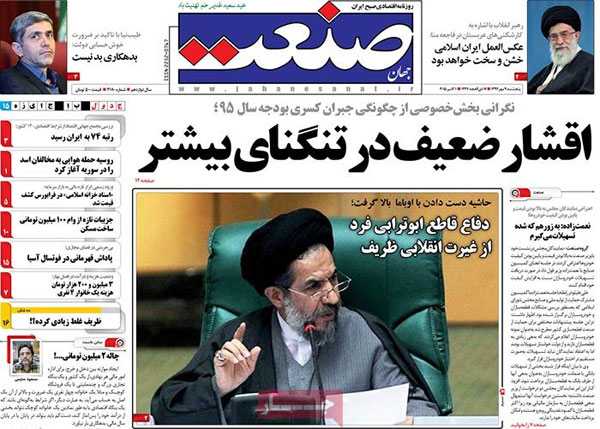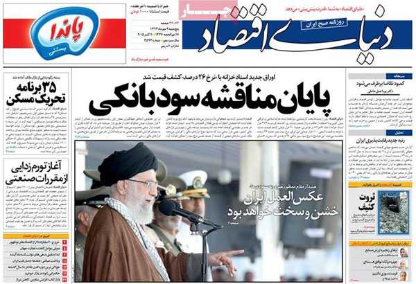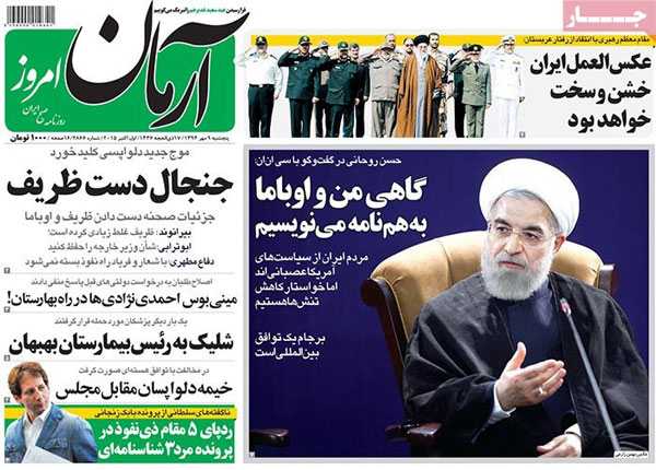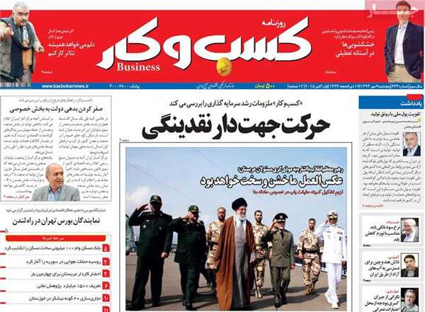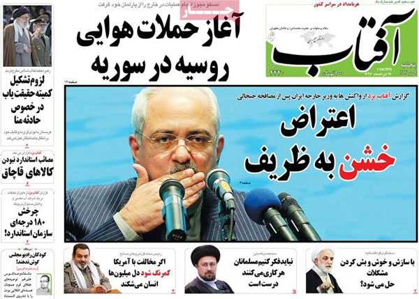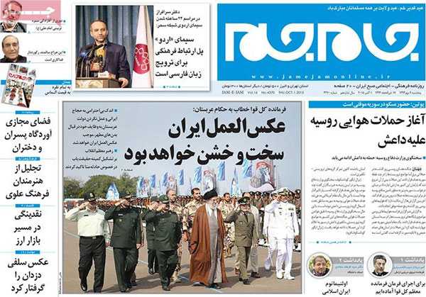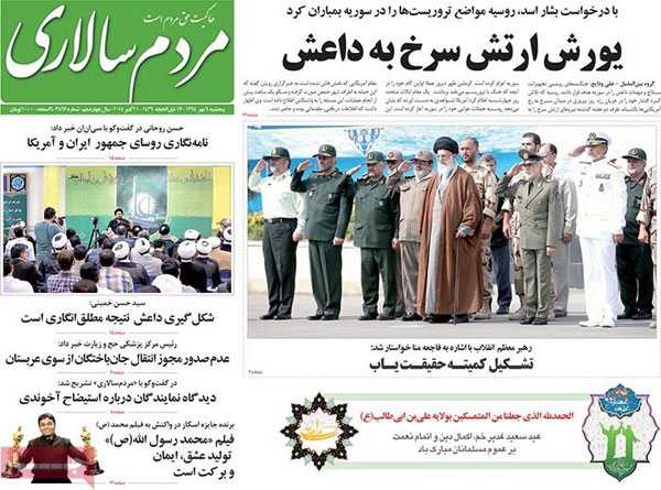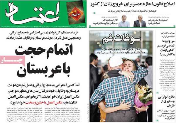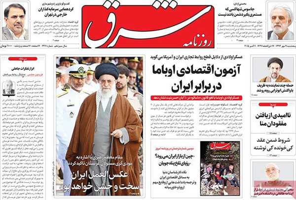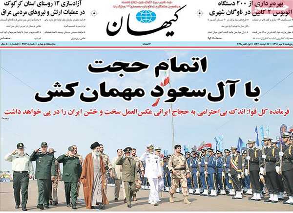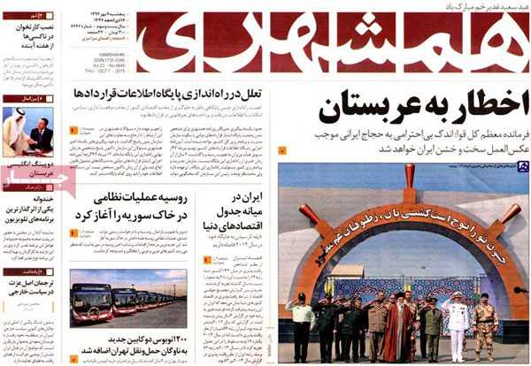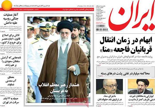 امروز پنجشنبه ۹ مهر ۱۳۹۴ در روزنامه های رسمی صبح کشور چه خواهید خواند؟ در صفحه اول روزنامه های امروز از جمله همشهری ، کیهان ، ابرار ، جام جم ، آرمان ، اعتماد، آفتاب ، مردم سالاری ، صنعت ، مهمترین تیتر به فرمایشات مقام معظم رهبری درباره فاجعه منا در عربستان ، تحولات نیویورک ، اعتراض به ظریف ، بازگشت حجاج ، حملات هوایی روسیه به داعش در سوریه ، بازگشت بانوان قهرمان فوتسال آسیا ، سخنان دکتر روحانی با سی ان ان که من گاهی به اوباما و گاهی اوباما به من نامه می نویسد ..