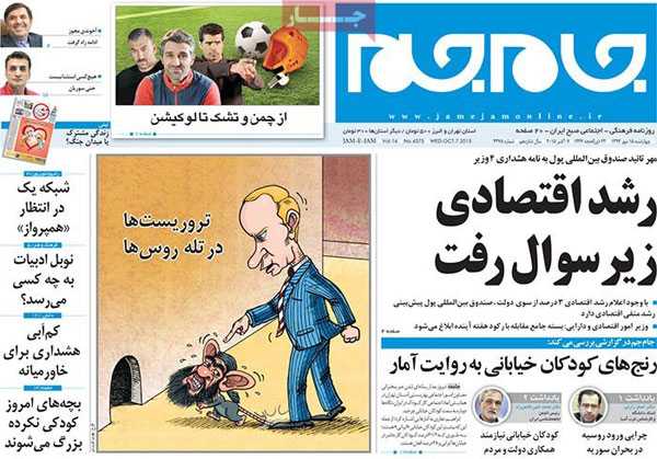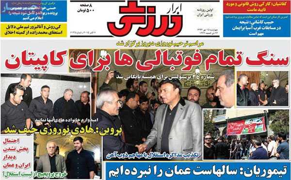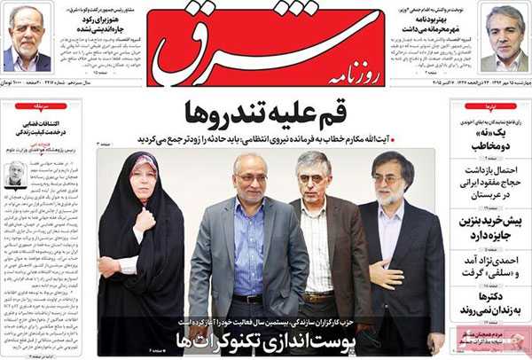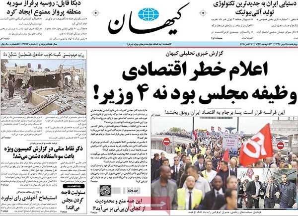 روزنامه های امروز چهارشنبه ۱۵ مهر ۹۴ چه چاپ کردند؟ تصویر صفحه اول روزنامه های مهم خبری صبح کشور با عناوین : استیضاح دلواپسان ، خداحافظی با هما روستا ، پاسخ ظریف به تهمت ها ، روسیه بر فراز آسمان سوریه ، قتل و خودکشی دختر و پسر جوان لاهیجانی ، زیر سوال رفتن رشد اقتصادی ، اقتصاد ایران پس از برجام ، سنگ تمام فوتبالی ها برای کاپیتان هادی نوروزی و..