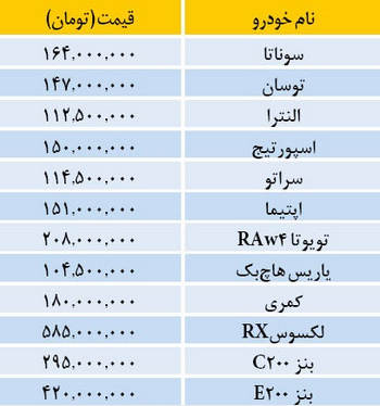 قیمت جدید خودروهای وارداتی سوناتا ، توسان ، النترا ، اسپورتیج ، سراتو ، اپتیما ، تویوتا RAW4 ، یاریس هاچ پک ، کمری ، بنز C200 ، E200 در بازار تهران به شرح زیر است.