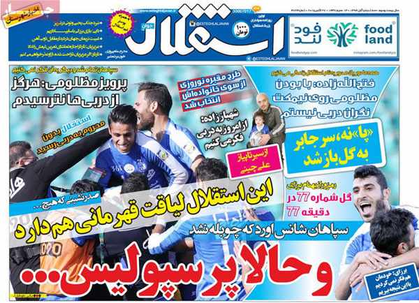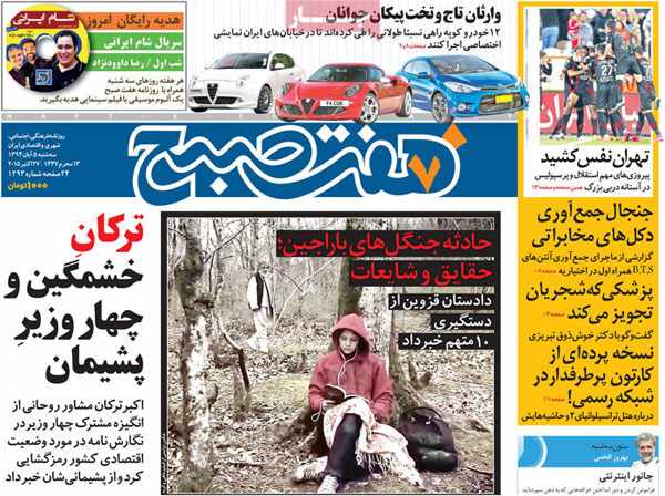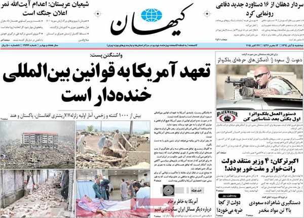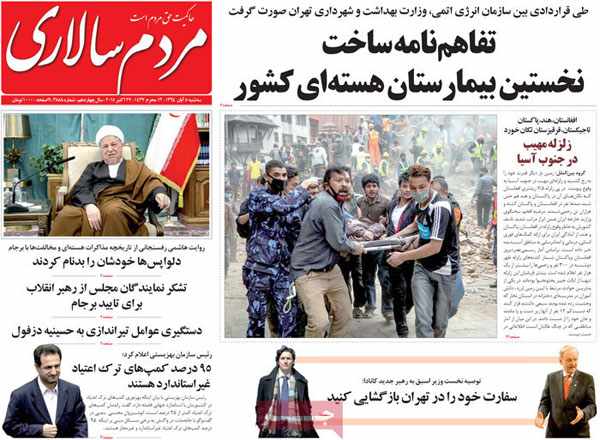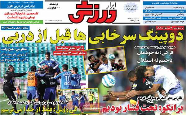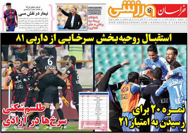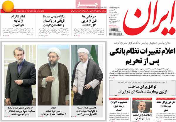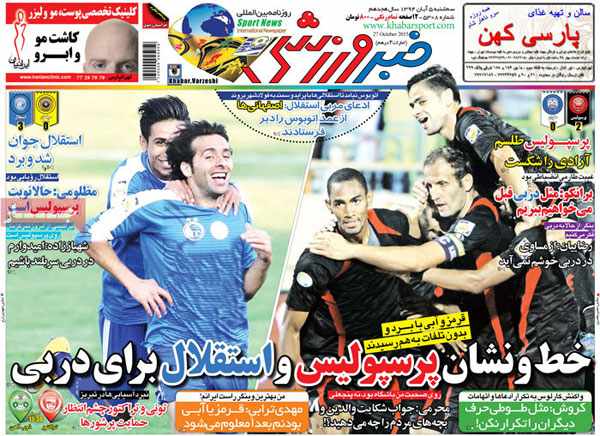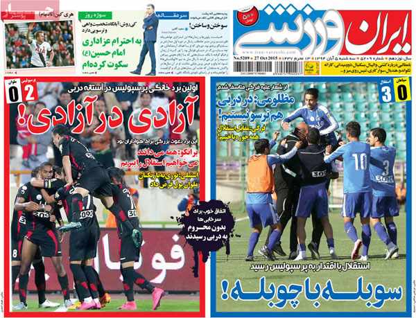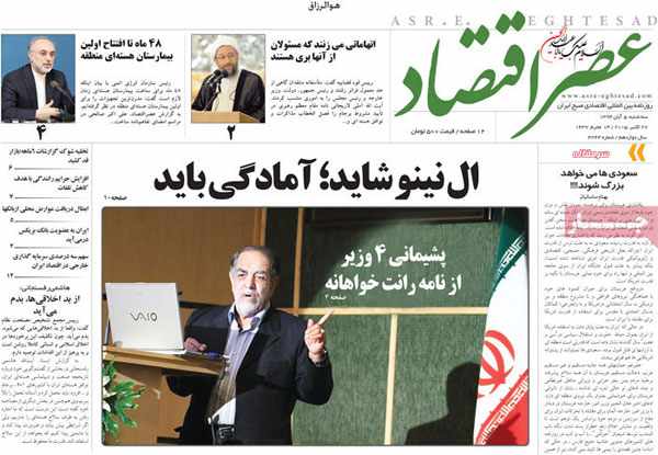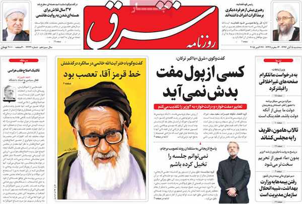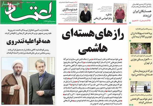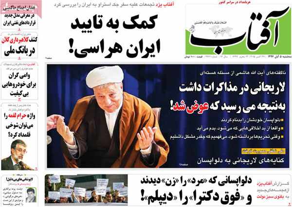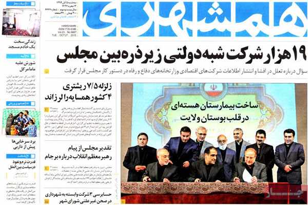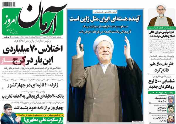 روزنامه های امروز سه شنبه ۵ آبان ۹۴ در صفحه اول به عناوین داغ و رویداد های پیش رو پرداختند ، اولین ساختمان هسته ای افتتاح می شود ، اختلاس ۷۰ میلیاردی در کرج ، آینده هسته ای ایران مانند ژاپن است ، هاشمی و رازهای هسته ای ، جنگل های بارجین، چتر عربستان و آمریکا بر سر داعش از حملات روسیه ، رانت خواری «چهار وزیر» ، دربی استقلال و پرسپولیس جمعه