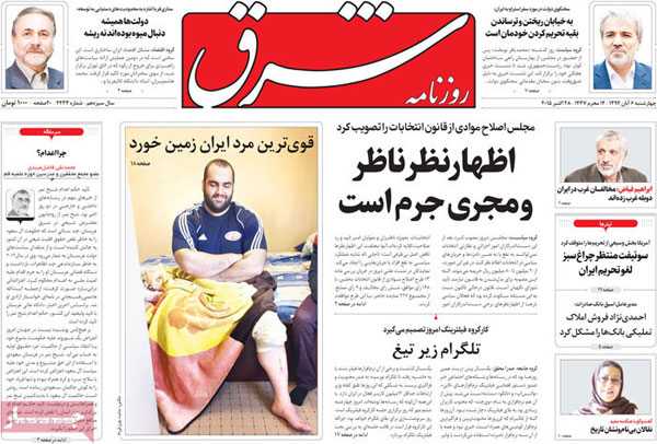تیتر و عناوین خبری روزنامه های امروز چهارشنبه ۶ آبان ۹۴ به روایت تصویر / تصویر صفحه اول روزنامه های رسمی اجتماعی ، سیاسی ، فرهنگی و ورزشی ایران با عناوین : توافق سرخ آبی ها : این بازی ۶ و ۴ نداریم فقط ۲۴ ، تلگرام زیر تیغ ، بازی پرسپولیس و استقلال در جمعه ، میلیاردر نفتی شماره حساب خواست ، امنیت کارت های بانکی زیر سوال ، قوی ترین مرد جهان در ایران زمین خودر! ، مخالفان برجام از مشکلات مردم بی خبرند، اگر روحانی سال ۸۴ رئیس جمهور می شد .